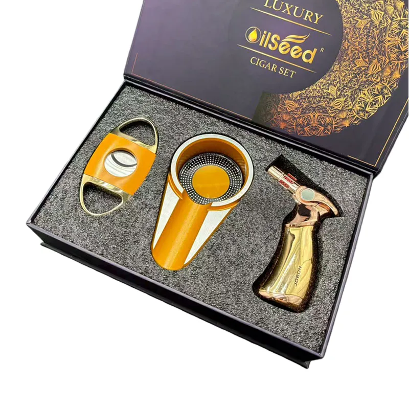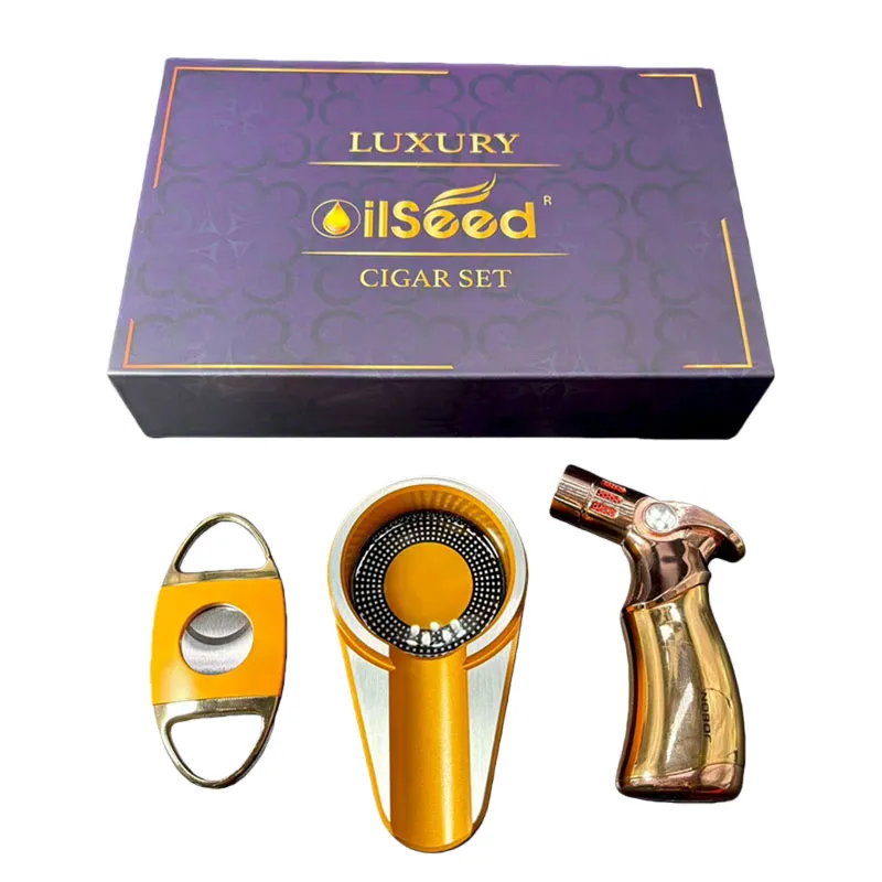 The OilSeed Luxury Cigar Set is an elegant collection of premium cigar accessories, thoughtfully packaged for cigar enthusiasts and gift buyers alike. Each set includes a double blade cigar cutter, a butane gas torch lighter, and an aluminum cigar ashtray with a single cigar holder—all designed with a sleek, luxury finish.