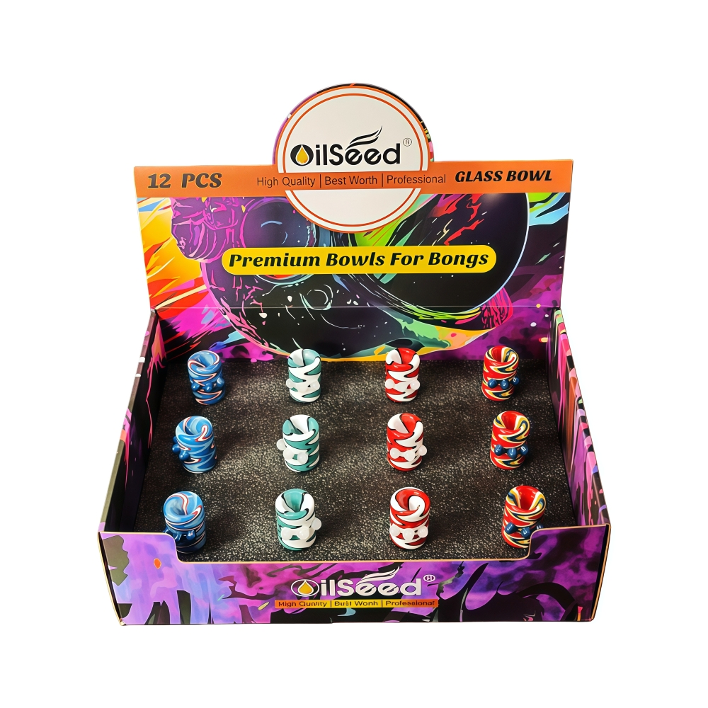 The OilSeed Plyre Glass Bow features unique reverse art multicolor designs, combining vibrant aesthetics with durable, high-quality glass construction. Each piece is designed for smooth, reliable use while offering an eye-catching appearance that stands out in retail displays.