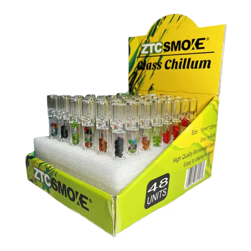 Designed for portability and convenience, these one-hitter style chillums are easy to use, clean, and carry. Perfect for smoke shops, gift sets, or wholesale distribution, each unit is packaged in a 48-piece display, with 12 displays per case for efficient stocking.