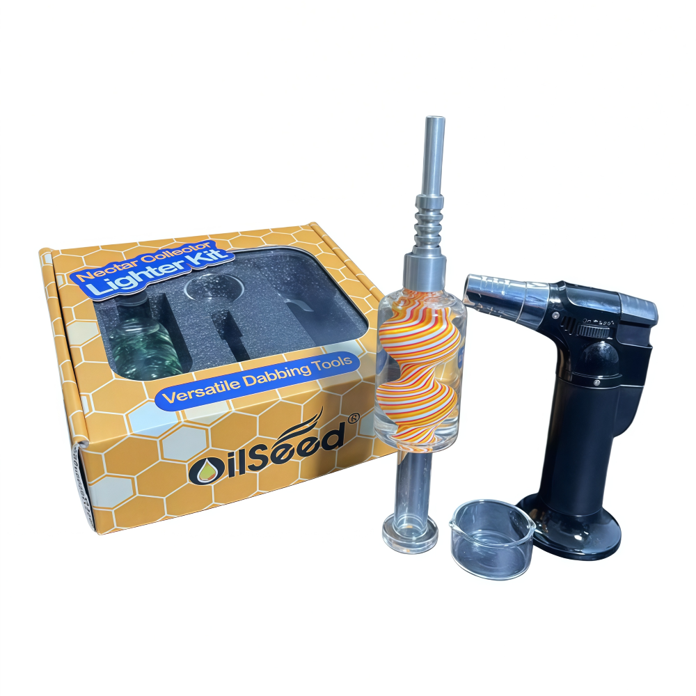 The OilSeed Nectar Collector Lighter Kit is a complete set for concentrate enthusiasts, combining convenience, durability, and style. Each kit features a glycerin nectar collector, a 510 thread mother joint, a glass dabbing dish, and a dab torch lighter, providing everything needed for precise, enjoyable dabbing sessions.