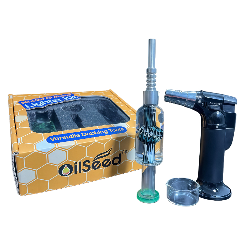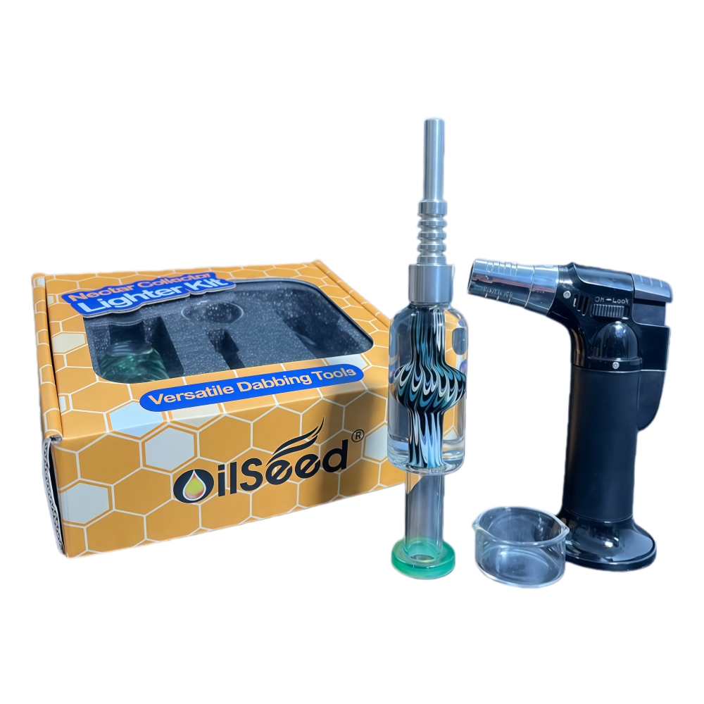 The OilSeed Nectar Collector Lighter Kit is a complete set for concentrate enthusiasts, combining convenience, durability, and style. Each kit features a glycerin nectar collector, a 510 thread mother joint, a glass dabbing dish, and a dab torch lighter, providing everything needed for precise, enjoyable dabbing sessions.