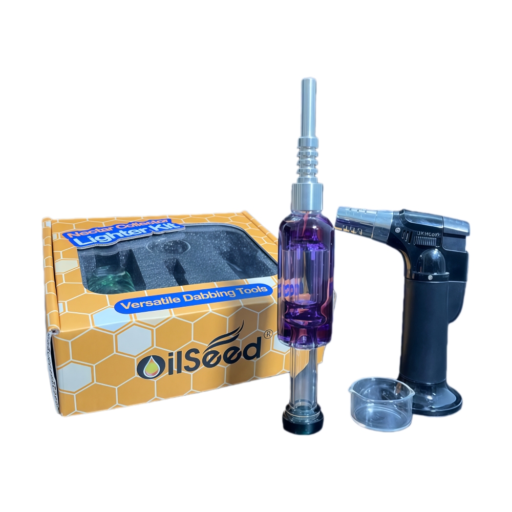 The OilSeed Nectar Collector Lighter Kit is a complete set for concentrate enthusiasts, combining convenience, durability, and style. Each kit features a glycerin nectar collector, a 510 thread mother joint, a glass dabbing dish, and a dab torch lighter, providing everything needed for precise, enjoyable dabbing sessions.