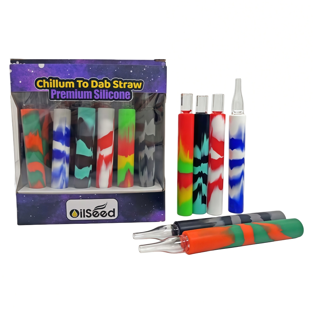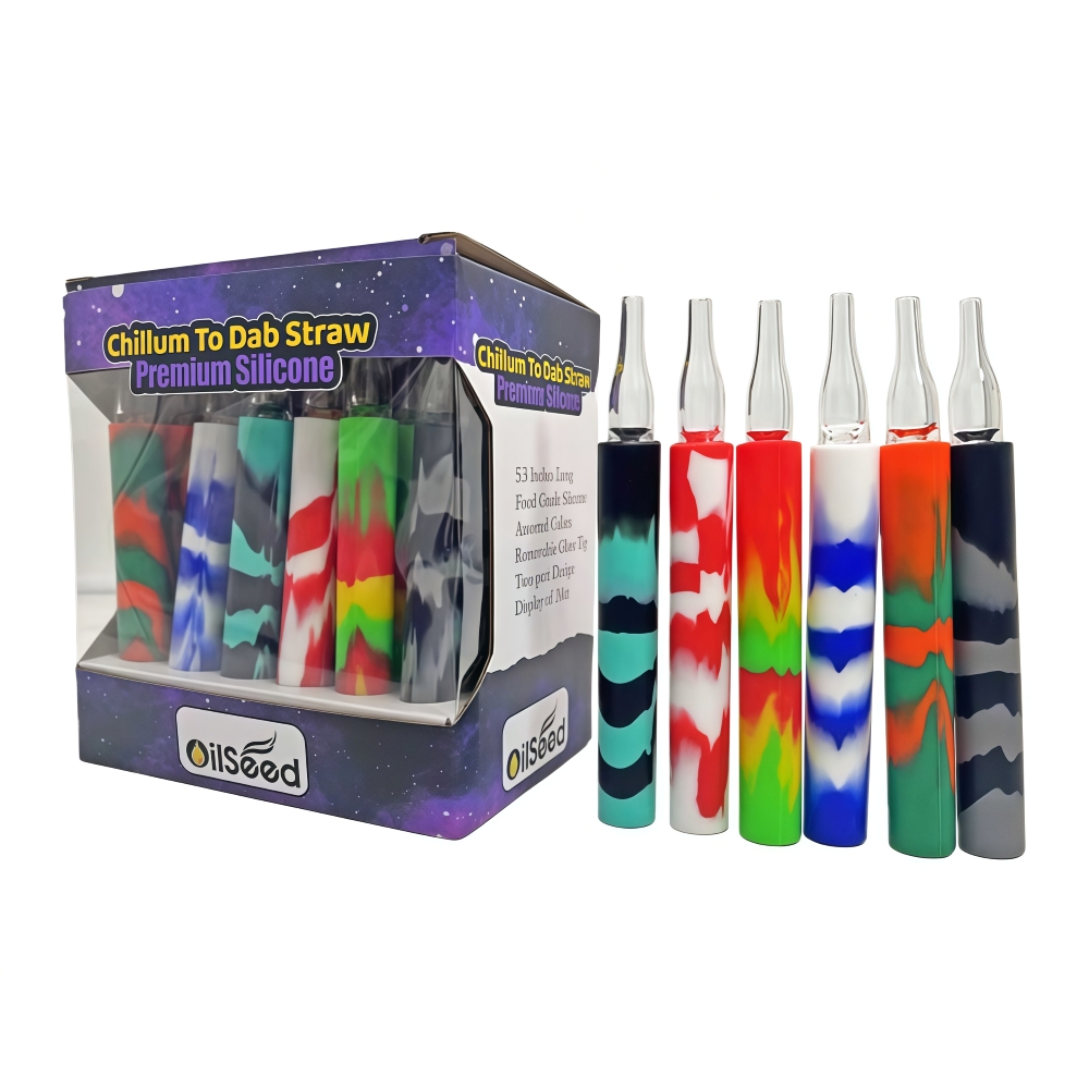 The OilSeed Chillum to Straw with Silicone Tube is a versatile and convenient tool designed for both dry and concentrate use. Featuring a glass dab tip and a built-in wax storage compartment, this piece combines function and portability in one smart design.