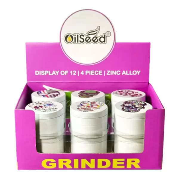 The OilSeed Skull Design Grinder is a stylish and durable 4-stage zinc alloy grinder, featuring bold and colorful skull artwork that makes it stand out from standard grinders. With a 50mm size, it offers efficient grinding performance while remaining compact and easy to carry. Each grinder includes sharp teeth for smooth grinding, a sifting screen, and a pollen catcher to maximize every use. The magnetic lid keeps everything secure, while the vibrant skull patterns add personality and visual appeal. Packaged in a 12-piece retail display, this set is perfect for smoke shops, wholesale, or anyone looking to add variety to their grinder collection.